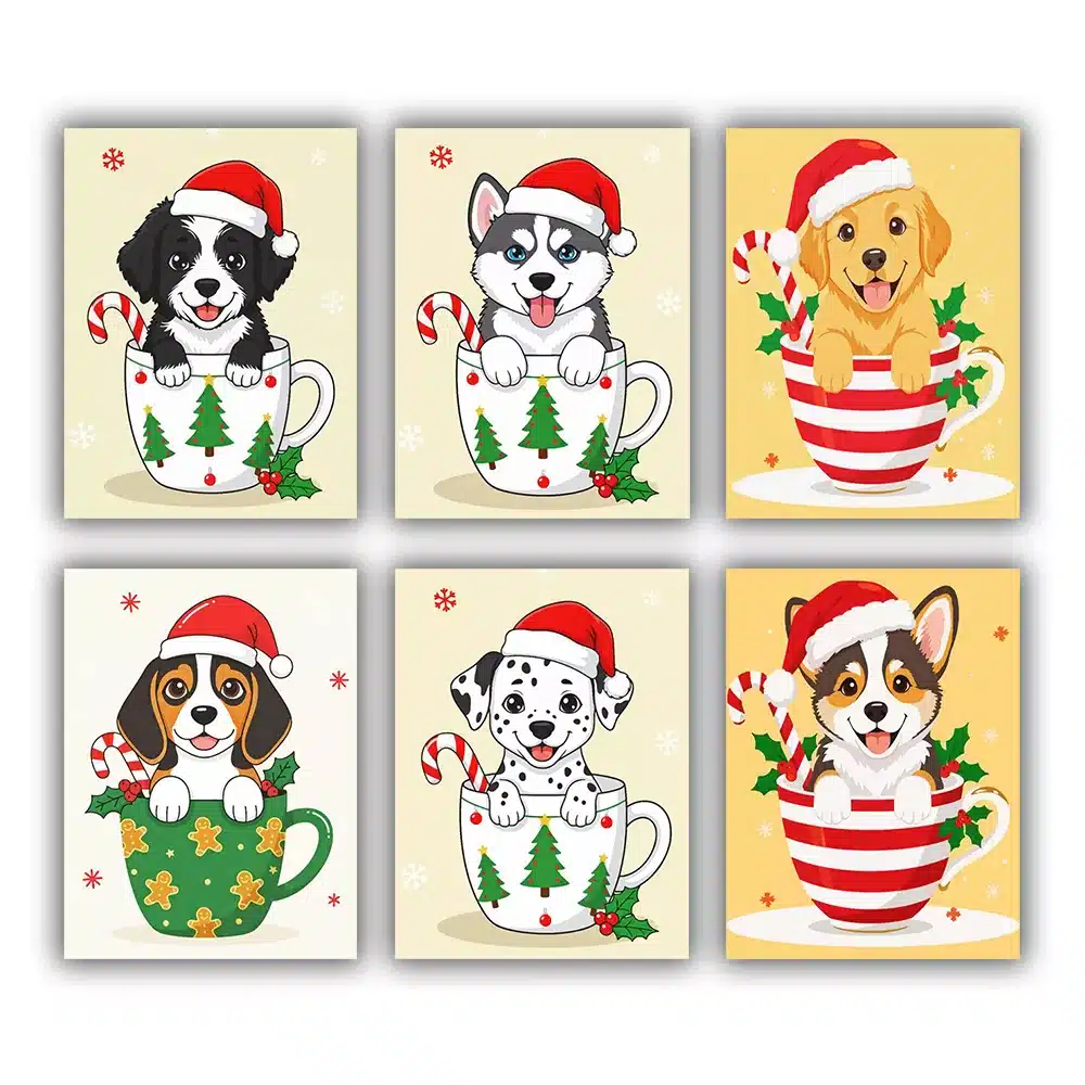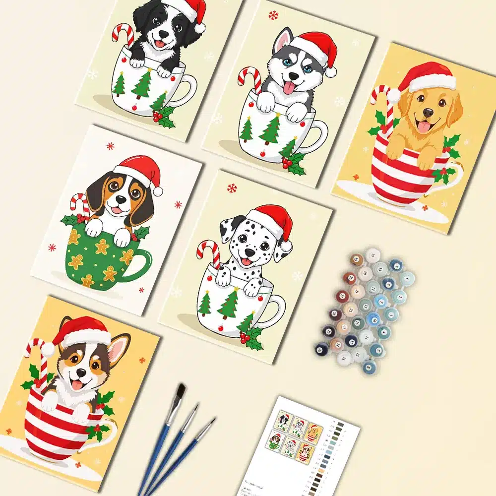 Bring extra holiday cheer to your home with our Christmas Dogs Mini Paint by Numbers Set. This adorable collection features six playful dogs dressed in festive outfits, from Santa hats to cozy winter scarves. Each mini canvas is simple and fun to paint, making it perfect for relaxing creative time. When displayed together, these cheerful designs create a cute and festive decoration that’s perfect for the holiday season