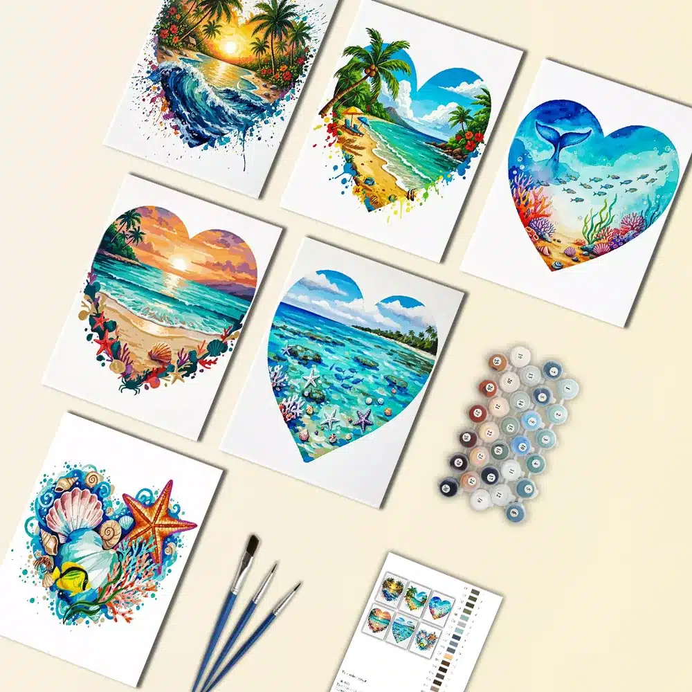 Our Mini Paint by Numbers kits come in beautiful themes like landscapes, flowers, animals, plants, and more. Each kit includes 6 mini canvases with the same theme, non-toxic paints, 3 brushes, a reference paper (layout), and hangers to display your artwork once finished easily.