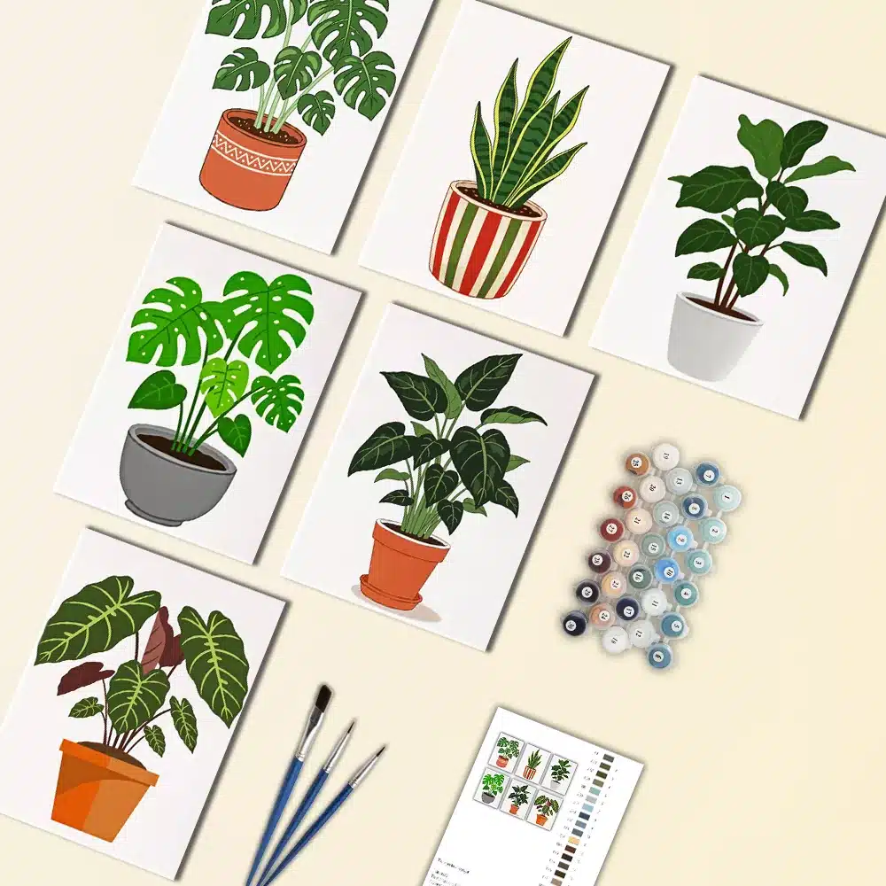 Our Mini Paint by Numbers kits come in beautiful themes like landscapes, flowers, animals, plants, and more. Each kit includes 6 mini canvases with the same theme, non-toxic paints, 3 brushes, a reference paper (layout), and hangers to display your artwork once finished easily.