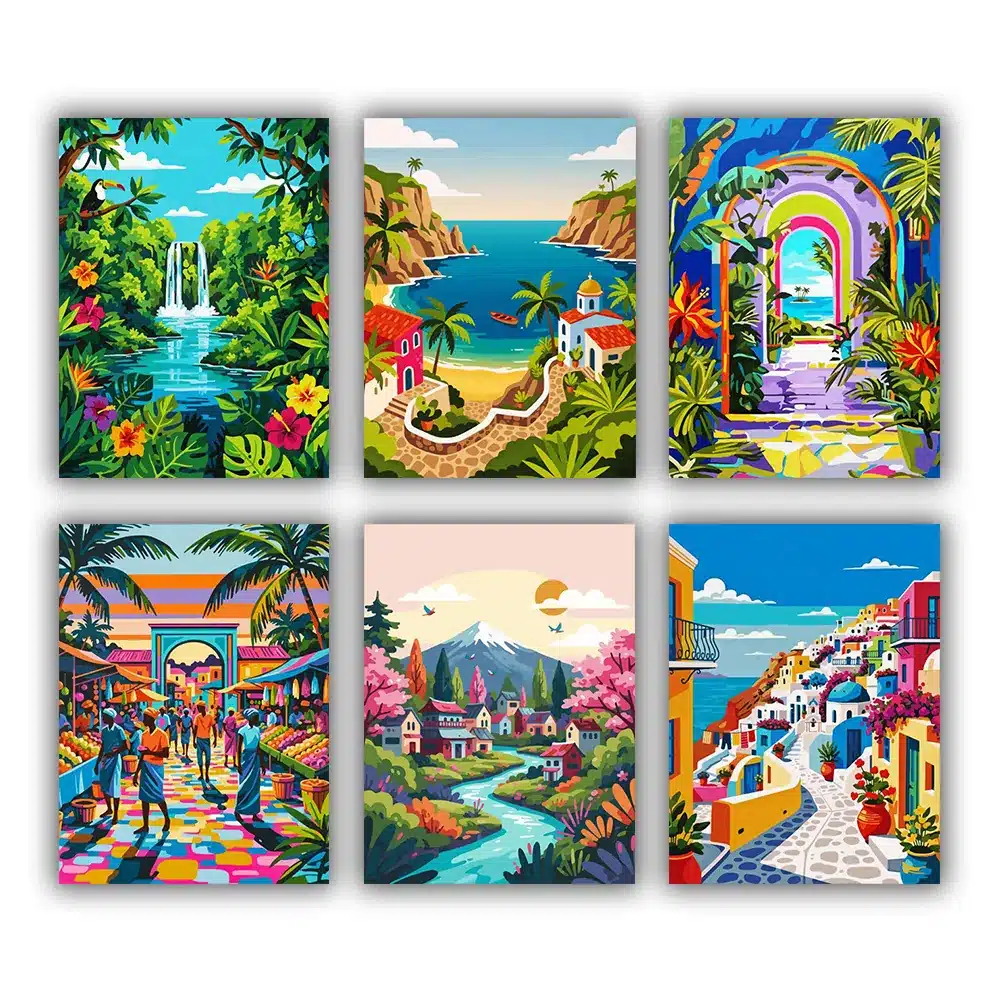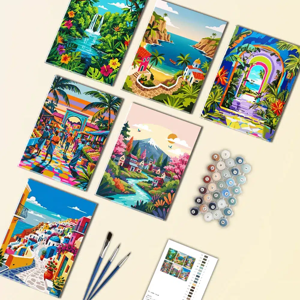 Our Mini Paint by Numbers kits come in beautiful themes like landscapes, flowers, animals, plants, and more. Each kit includes 6 mini canvases with the same theme, non-toxic paints, 3 brushes, a reference paper (layout), and hangers to display your artwork once finished easily.