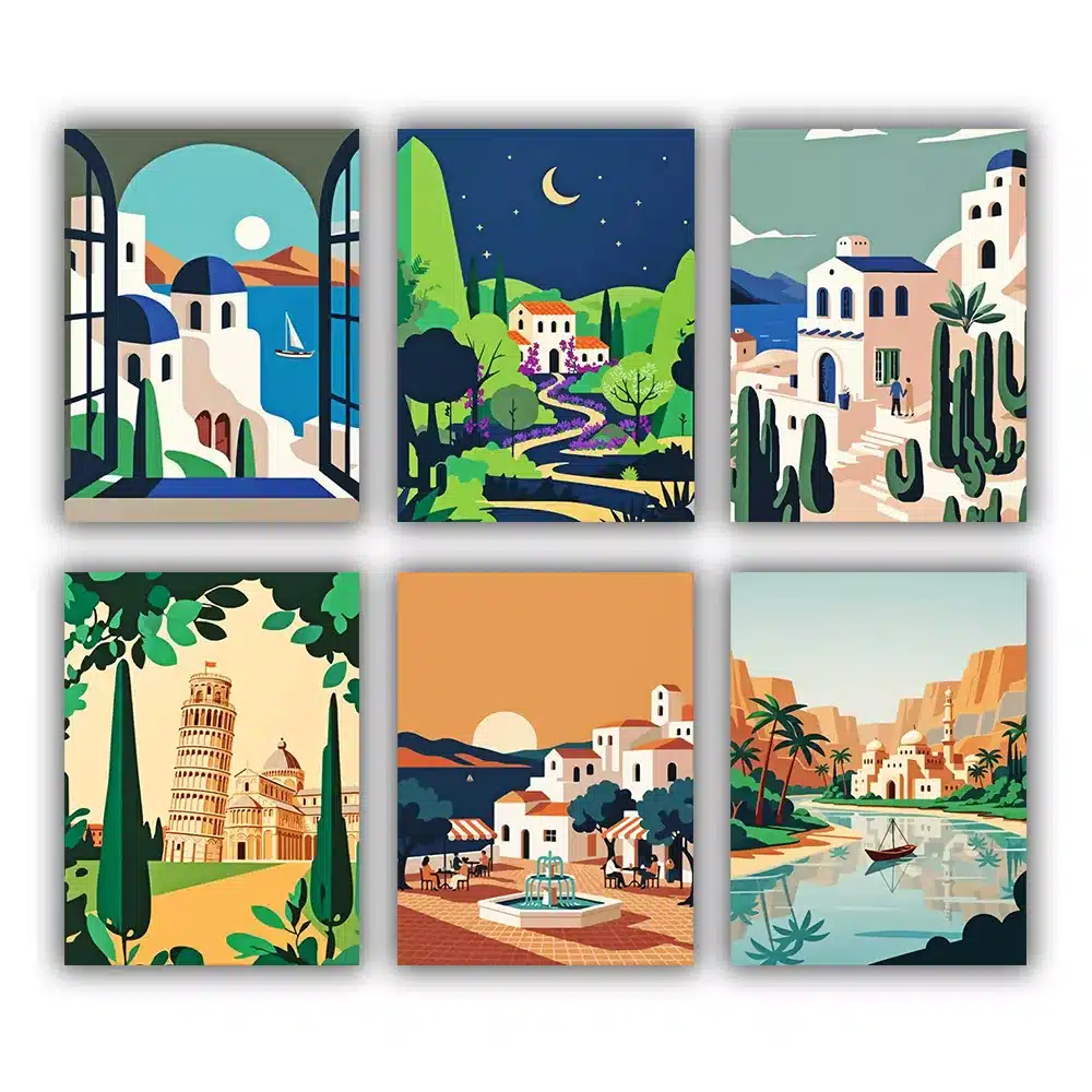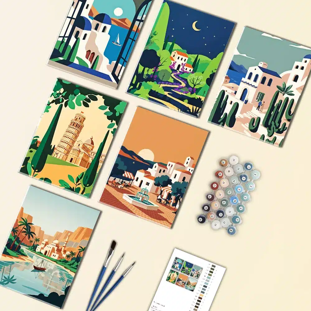 Enjoy peaceful moments through art with our Scenic Strolls Mini Paint by Numbers Set. This beautiful collection features six charming landscape scenes, including quiet streets, cozy towns, sunny seaside views, and relaxing nature paths. Each mini canvas is simple and enjoyable to paint, making it perfect for a calming creative activity. When displayed together, these artworks create a lovely travel-inspired gallery that brings warmth and charm to your space