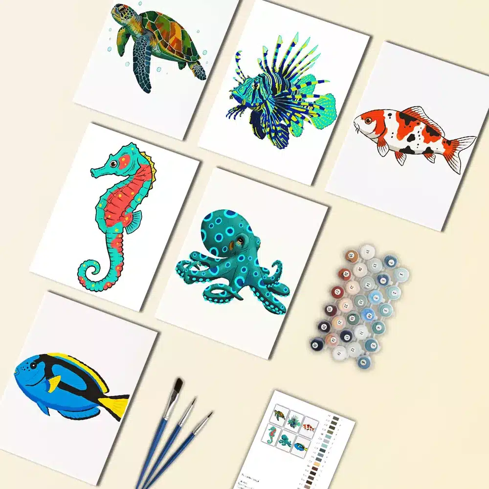 Dive into a colorful underwater world with our Sea Creatures Mini Paint by Numbers Set. This fun collection features six ocean-inspired designs, including tropical fish, a seahorse, coral, and other fascinating sea life. Each mini canvas is easy and relaxing to paint, making it perfect for a creative break. When displayed together, they create a bright and playful ocean-themed decoration that brings a splash of the sea into your home